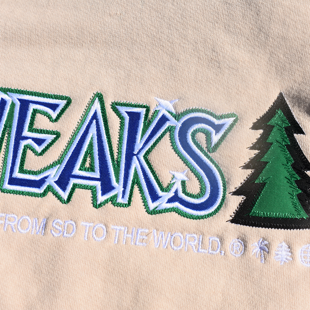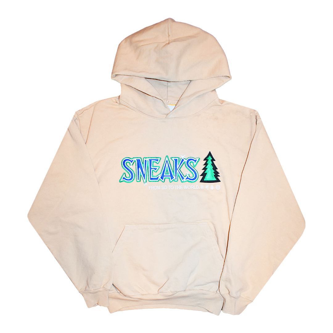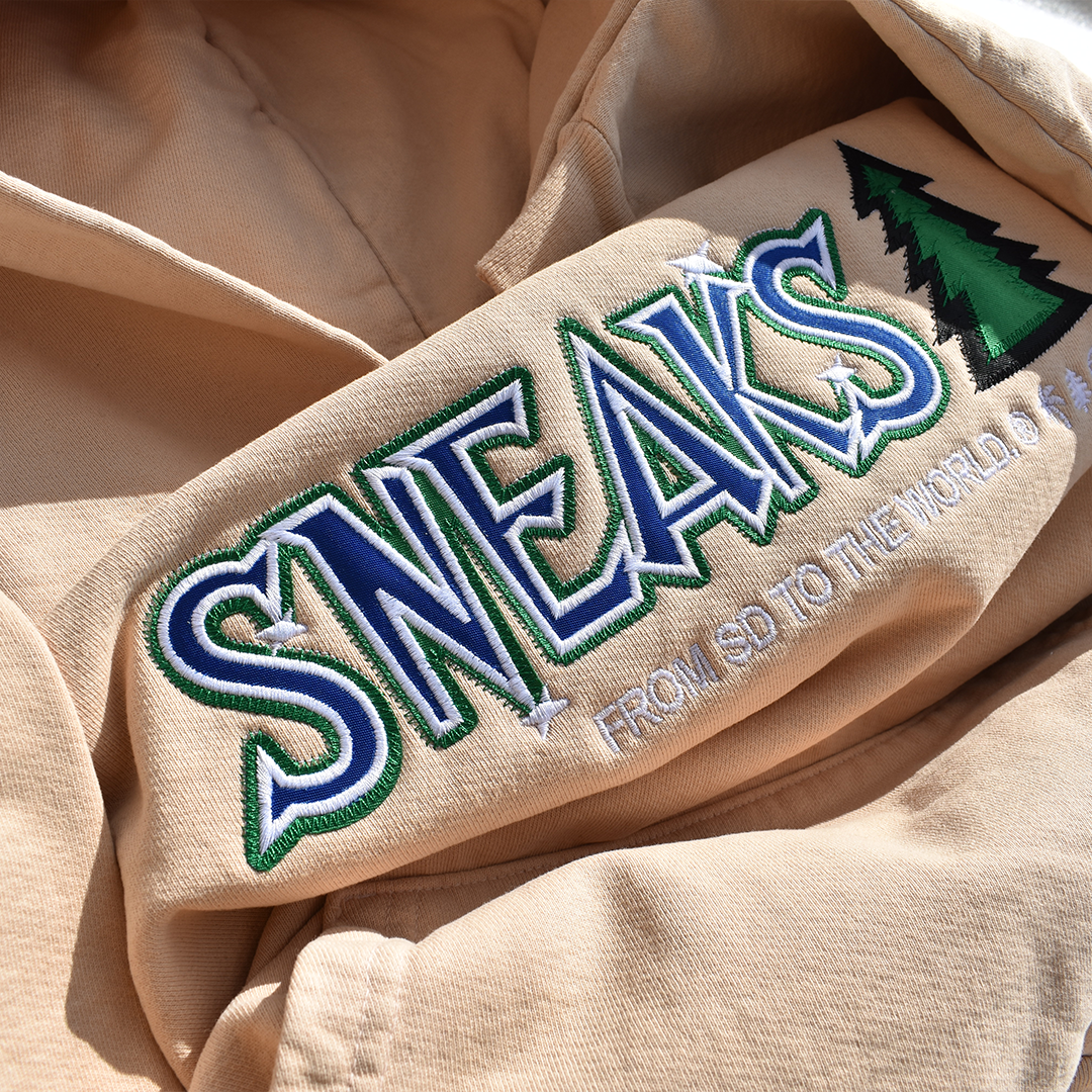 heavy fleece hoodie with tackle twill embroidery on chest. like a stitched jersey.